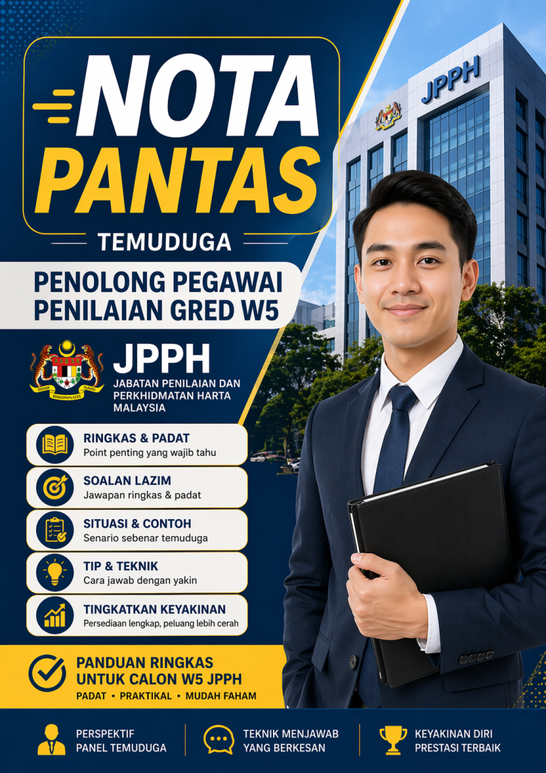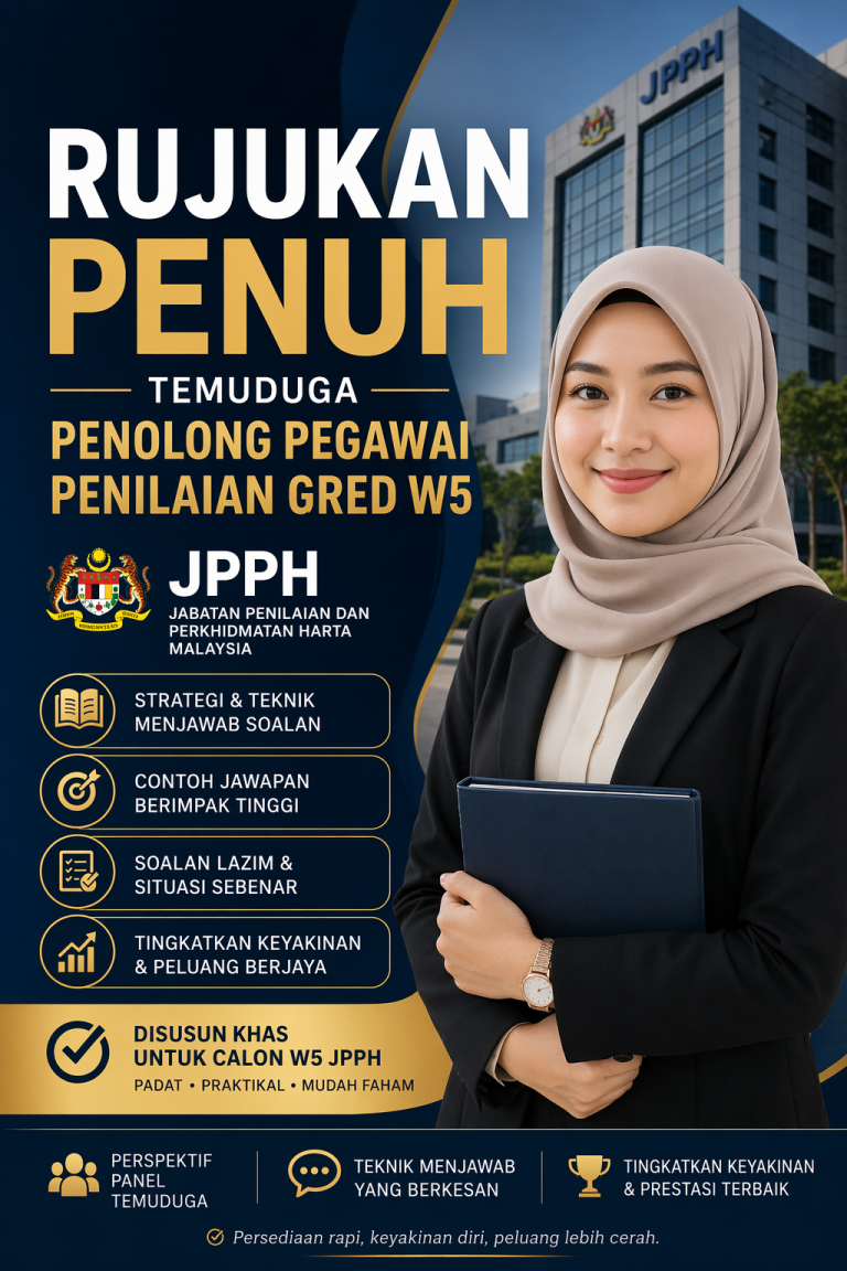 Untuk bantu calon seperti anda, kami hasilkanย ๐ Panduan Temudugaย Penolong Pegawai Penilaian Gred W5 (JPPH)